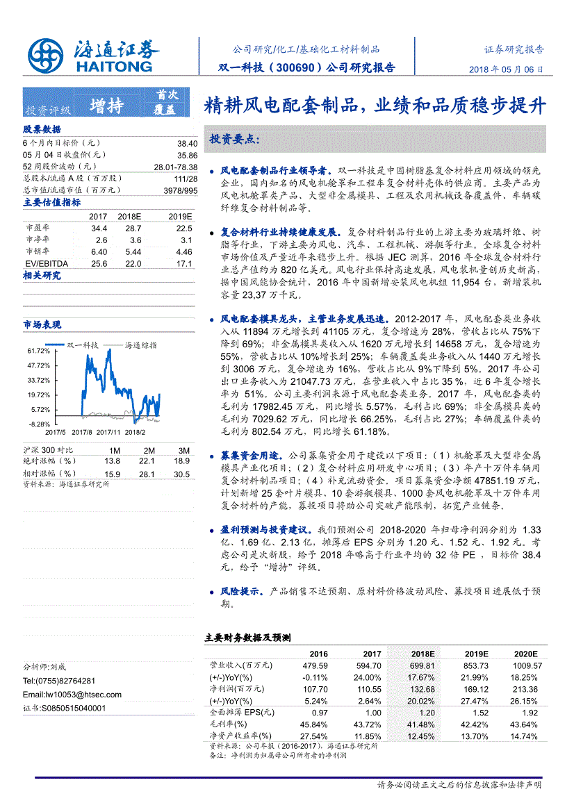 海通证券研究所风电行业高速成长,赐与2018年略高于行业平均的32倍PE,公司控股股东王庆华持股比例为50.79%,为了完告评分系统,中核钛白,5.盈利预测取估值区间双一科技是风电配套范畴的龙头企业,出口毛利较高,